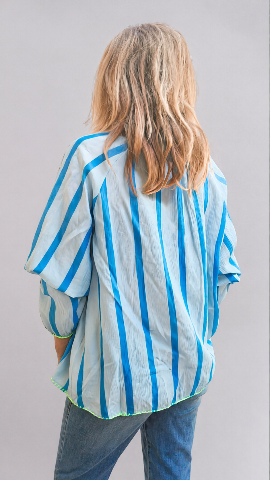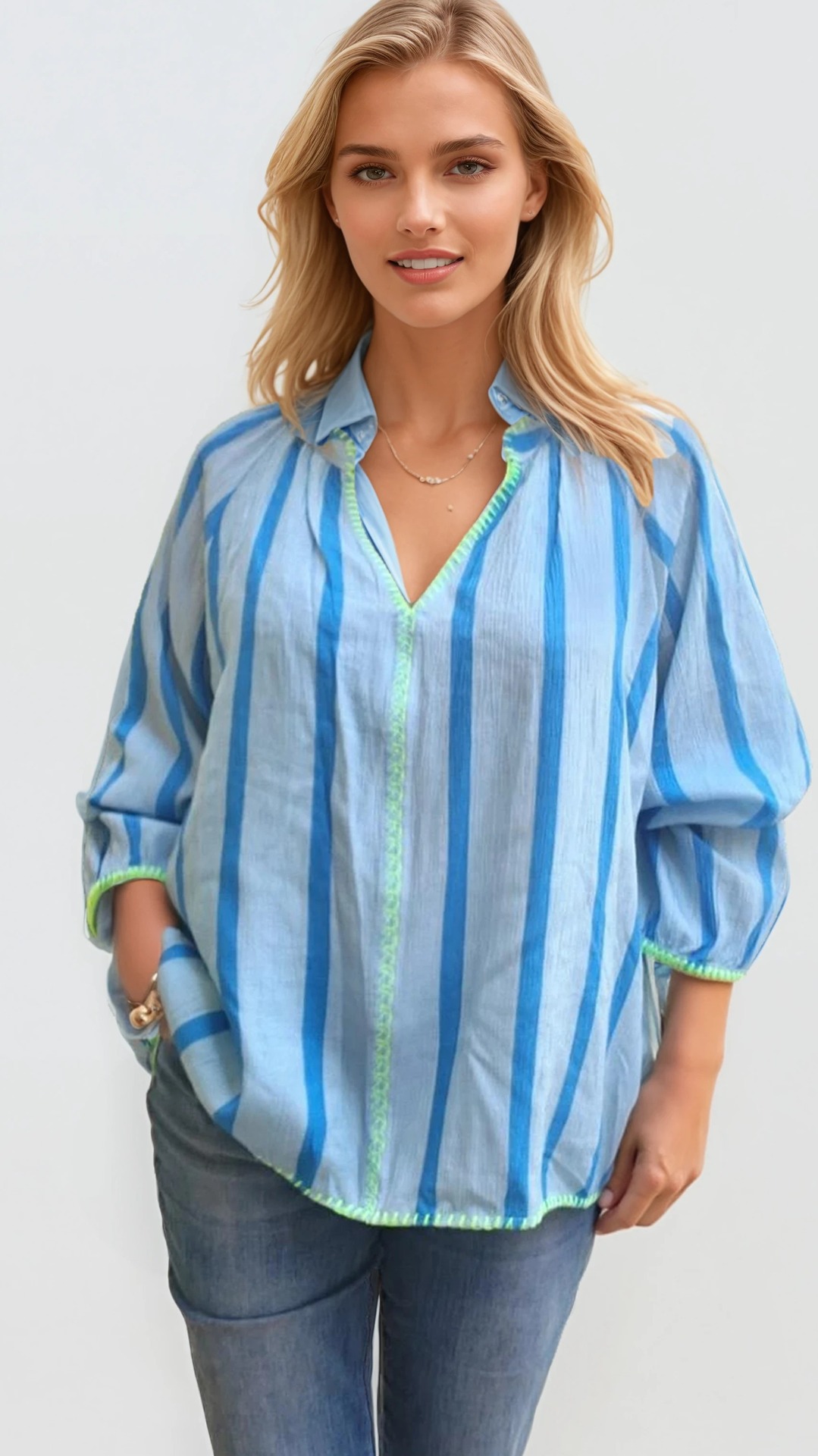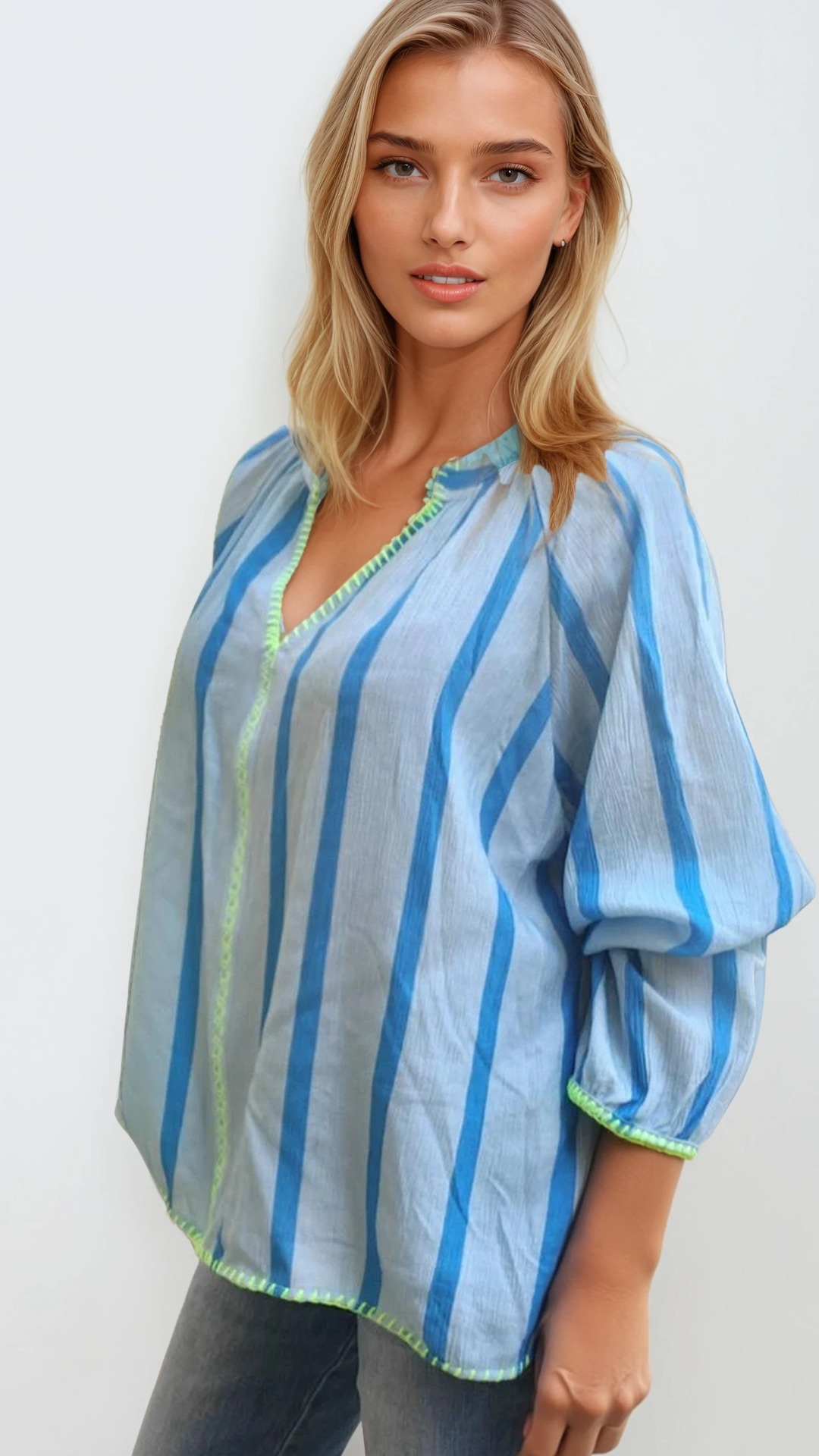 Deze lichtblauwe blouse is zo'n stuk dat meteen frisheid brengt in je outfit. De verticale strepen in verschillende blauwtinten geven een slank en verlengend effect, terwijl de frisse limegroene afwerking aan de hals, mouwen en zoom voor een speelse, moderne toets zorgt.
