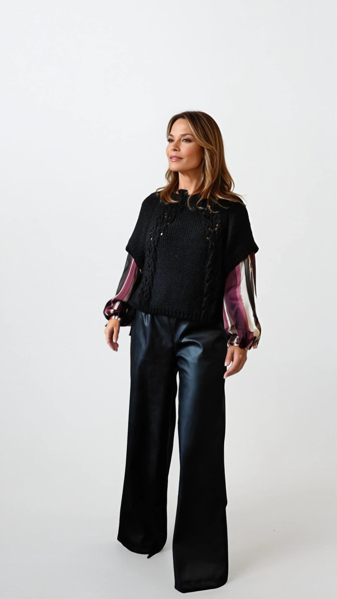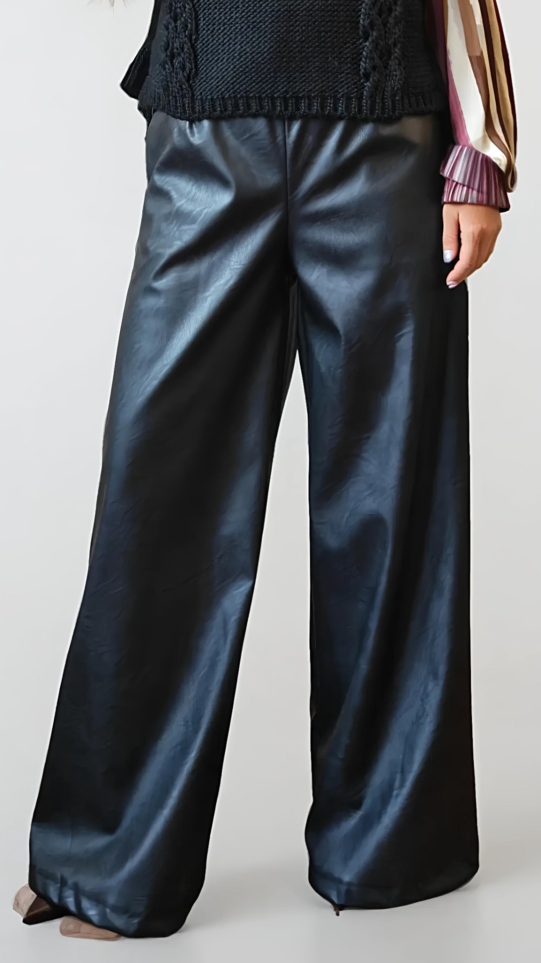 Deze lederlook broek is het perfecte statement piece voor wie houdt van stijl met comfort. De soepele stof heeft een subtiele glans en voelt heerlijk zacht aan, terwijl de elastische tailleband vooraan én achteraan zorgt voor een aangename pasvorm die zich moeiteloos aanpast van maat 38 tot 42.