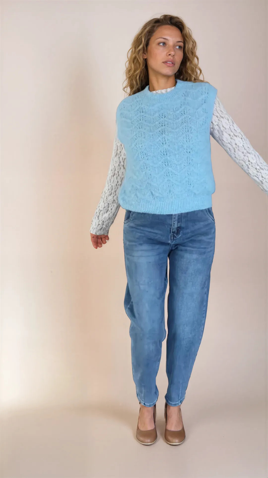 Deze babyblauwe spencer brengt meteen licht en frisheid in je outfit. De zachte wolmix met 10% lana wool voelt warm aan zonder zwaar te zijn en is ideaal voor laagjes in elk seizoen.