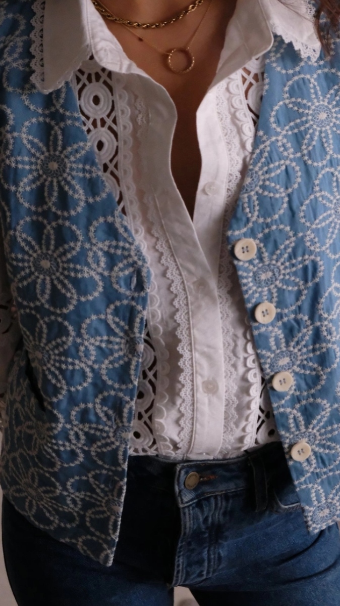 Een jasje met een tijdloze uitstraling dat finesse en moderniteit combineert. De zachte hemelsblauwe kleur en het opengewerkte bloemenborduurwerk maken het tot een uniek en elegant stuk.
