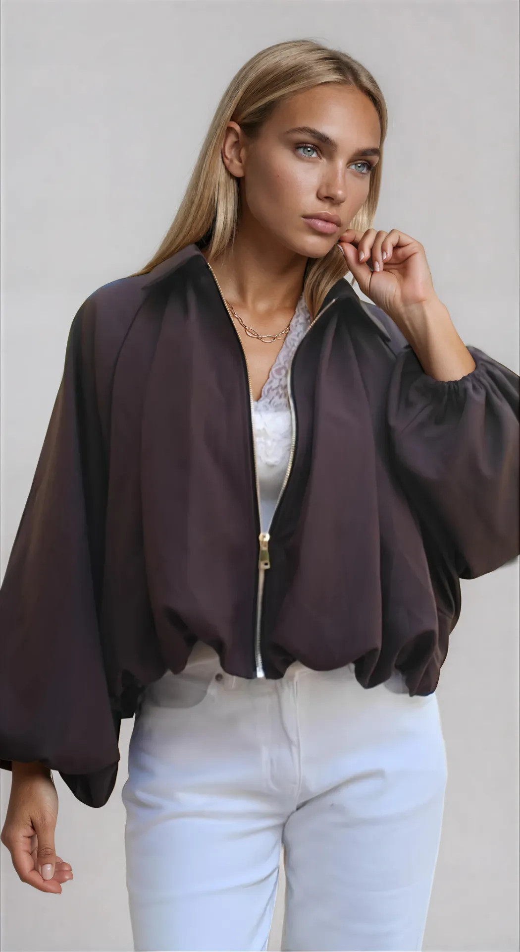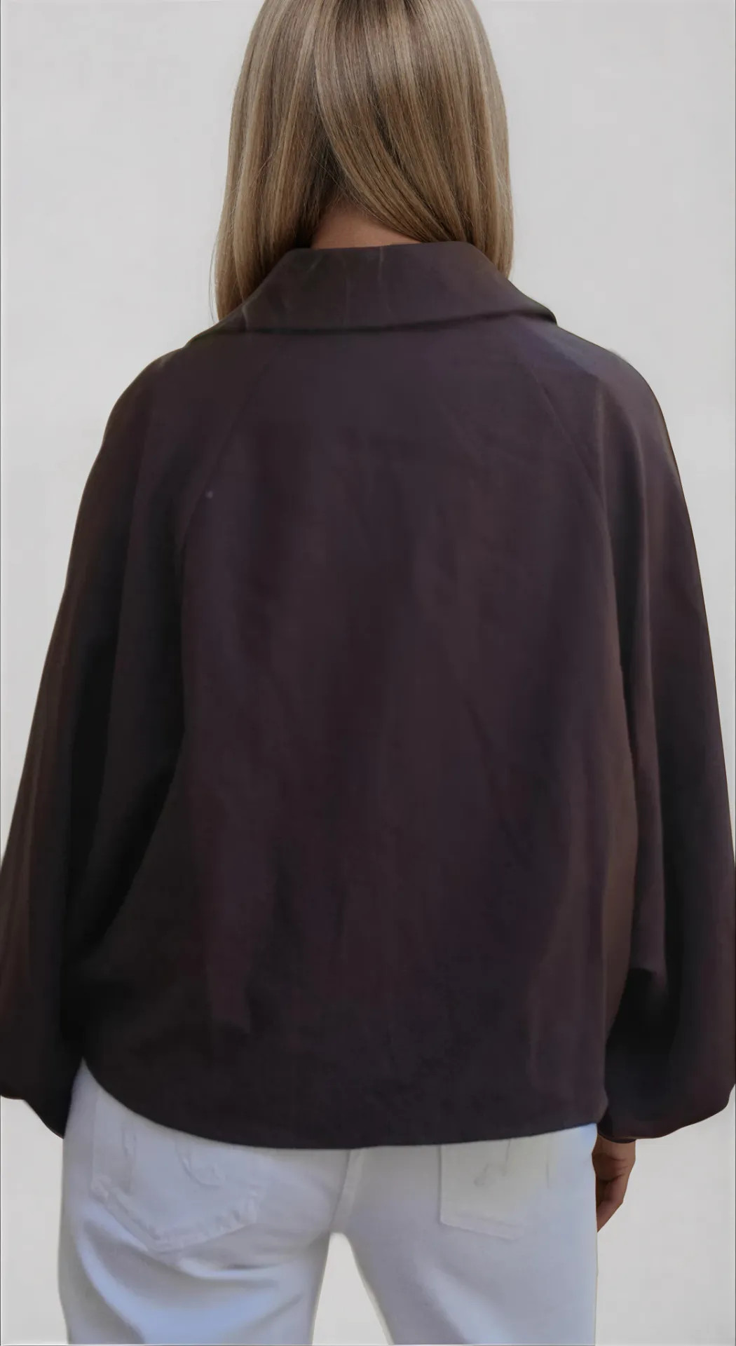 Dit chocoladebruine jasje is de donkere variant van ons geliefde Amélie jasje. De vorm is los, luchtig en elegant, met een subtiel blousend effect onderaan. De ruime ballonmouwen geven het jasje die moderne, editorial look zonder overdreven te worden.