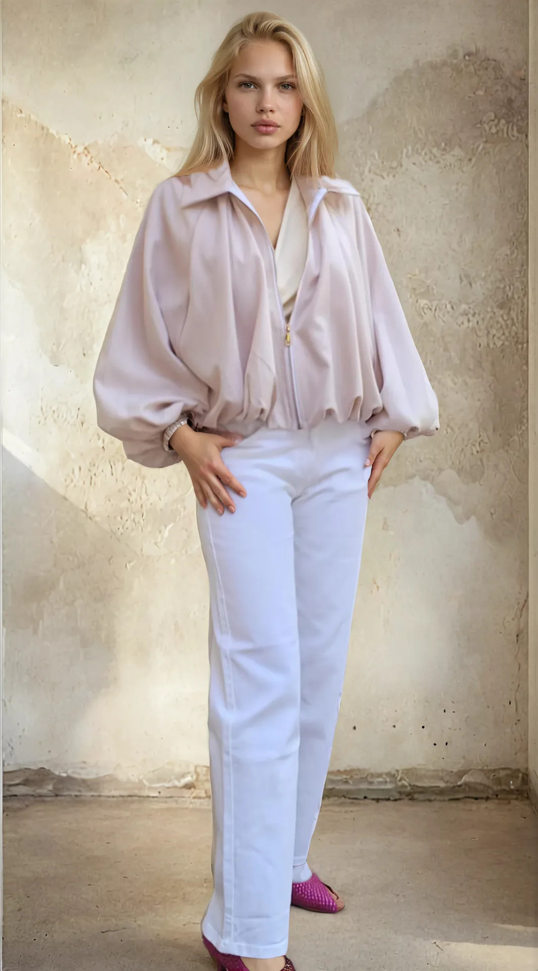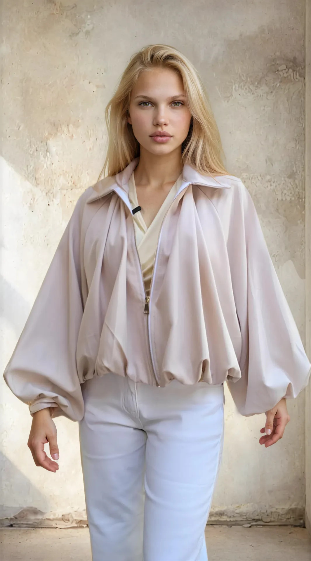 Dit zacht beige jasje is echt een pareltje voor wie graag iets vrouwelijk en stijlvol draagt, zonder dat het te stijf wordt. Het heeft een losse, blousende pasvorm met een elastische boord onderaan, waardoor het vanzelf mooi valt op je broek. Je hoeft er dus niet aan te trekken of te prutsen: rits dicht, laten vallen en klaar.