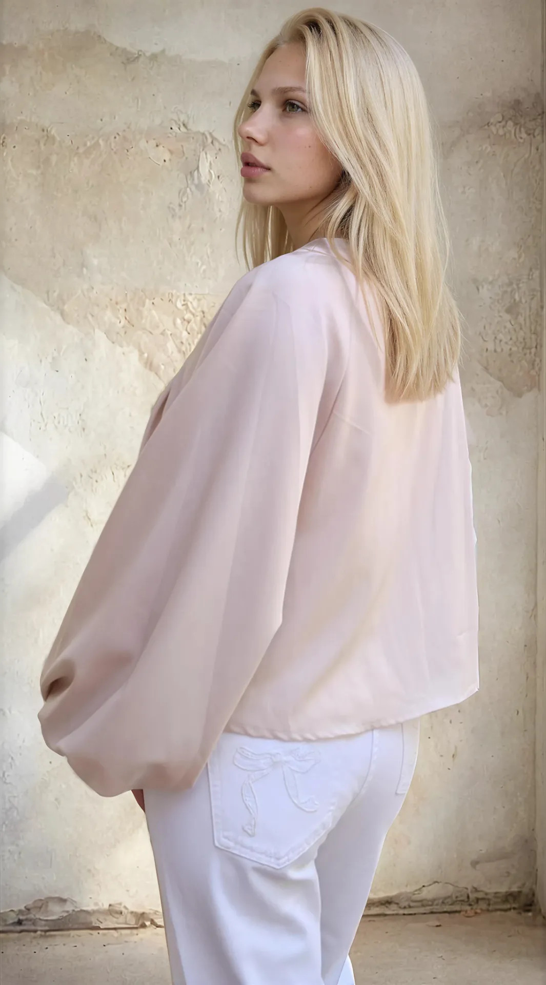 De grote ballonmouwen maken het jasje speciaal. Niet saai, niet standaard, maar wel heel draagbaar. De stof voelt licht en soepel aan, waardoor je het makkelijk draagt over een topje, blouse of fijn truitje.