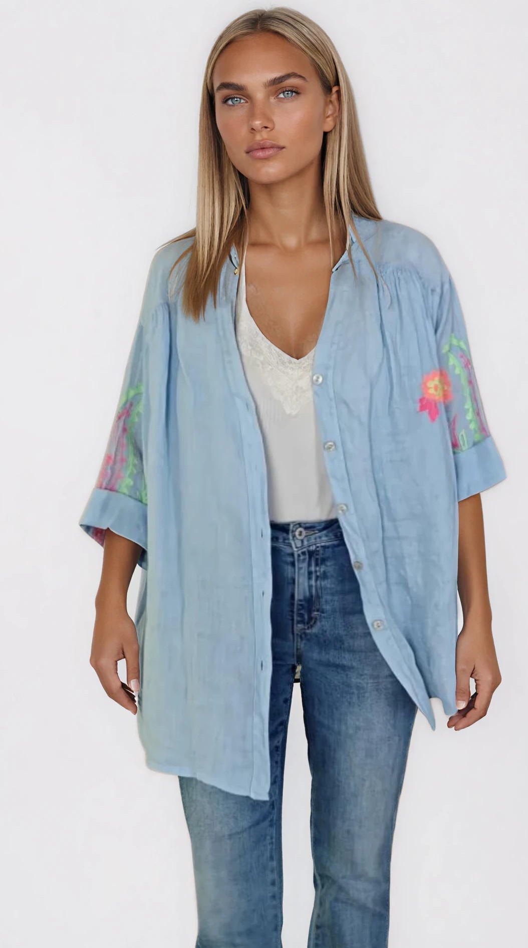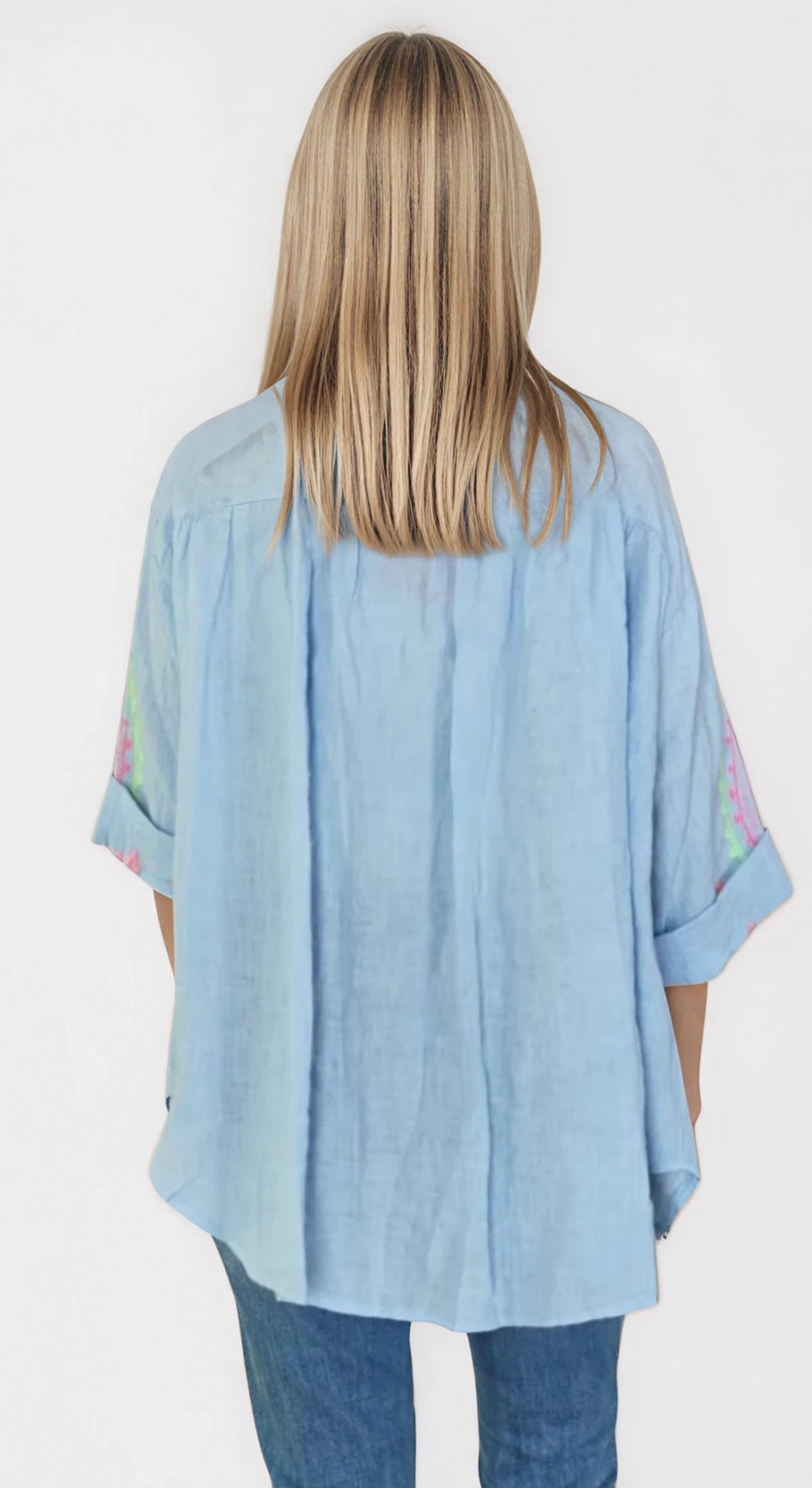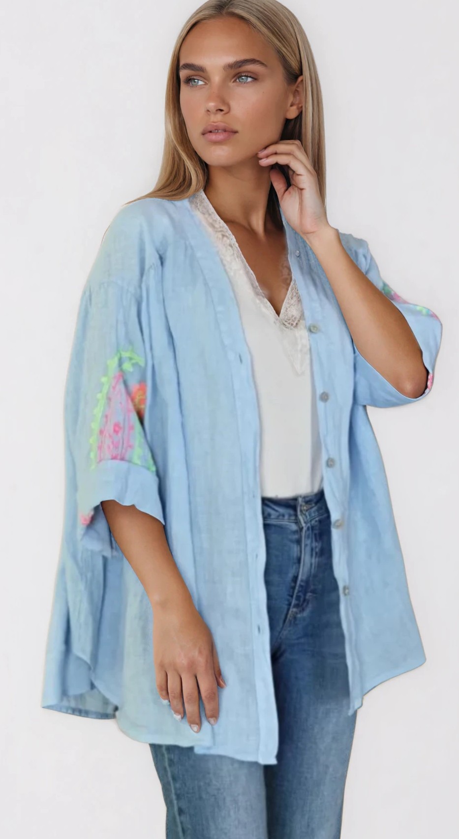 Deze lichtblauwe linnen blouse is zo'n heerlijk luchtig stuk dat je op verschillende manieren kan dragen. De blouse heeft een losse, elegante pasvorm en valt mooi soepel over het lichaam. De geborduurde details op de mouwen geven haar net dat extra vrouwelijke accent, zonder dat het te druk wordt.