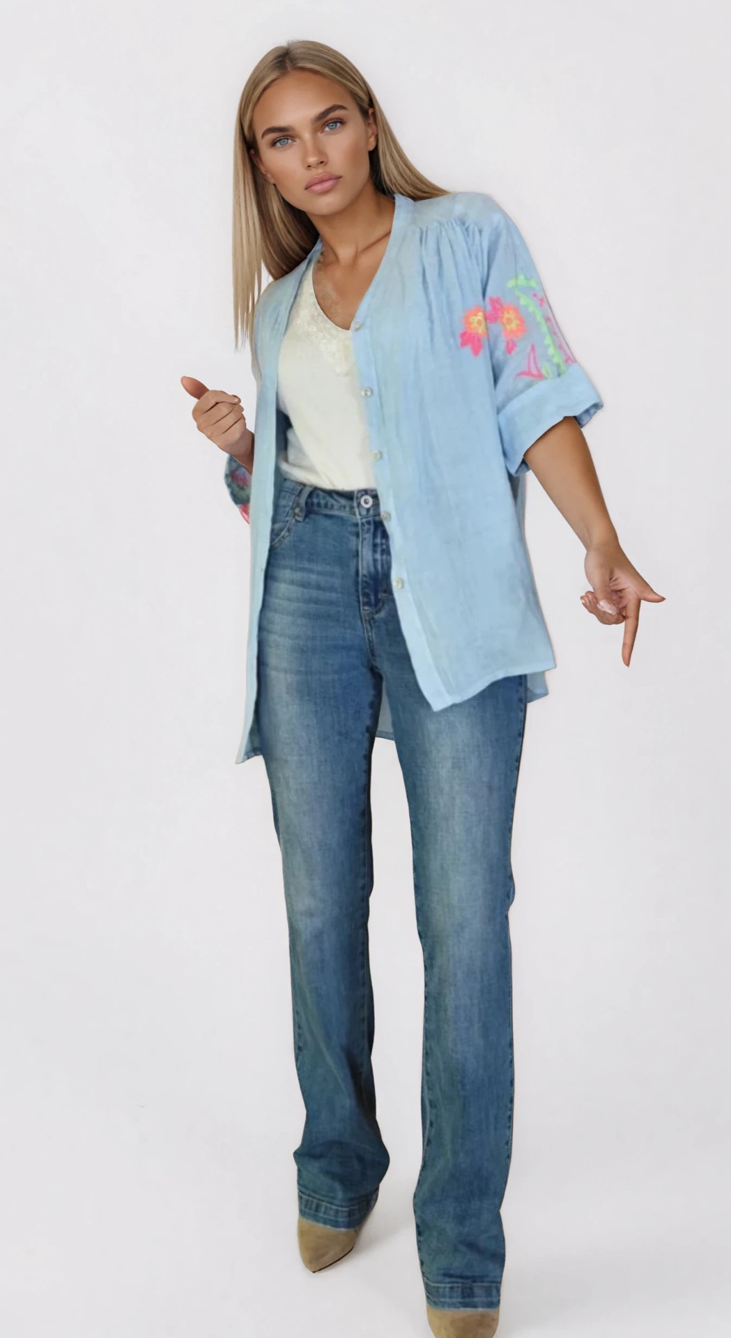 Draag de blouse open over een topje of kanten hemdje voor een relaxte, laagjeslook. Heel mooi op een jeans, witte broek of linnen broek. Dit geeft een effortless, bohemian-chic uitstraling. Ideaal voor overdag, op vakantie of als luchtig jasje op warmere dagen.