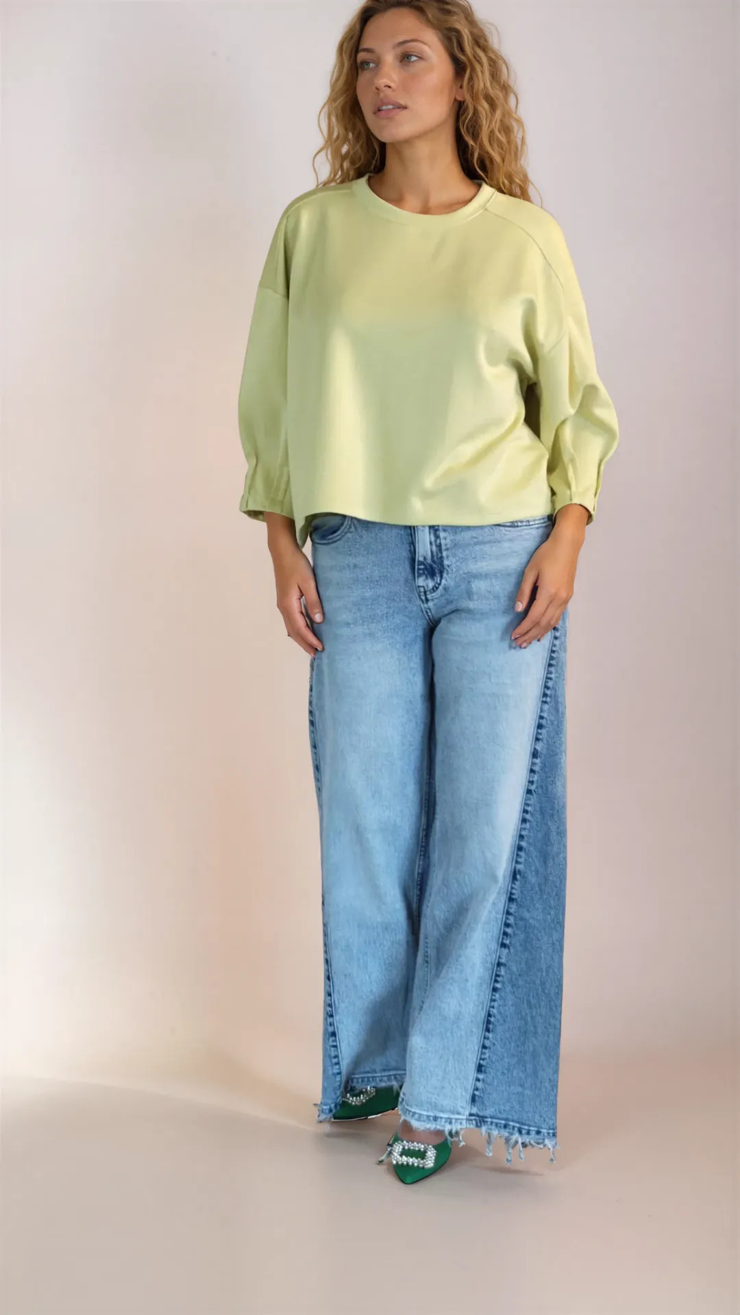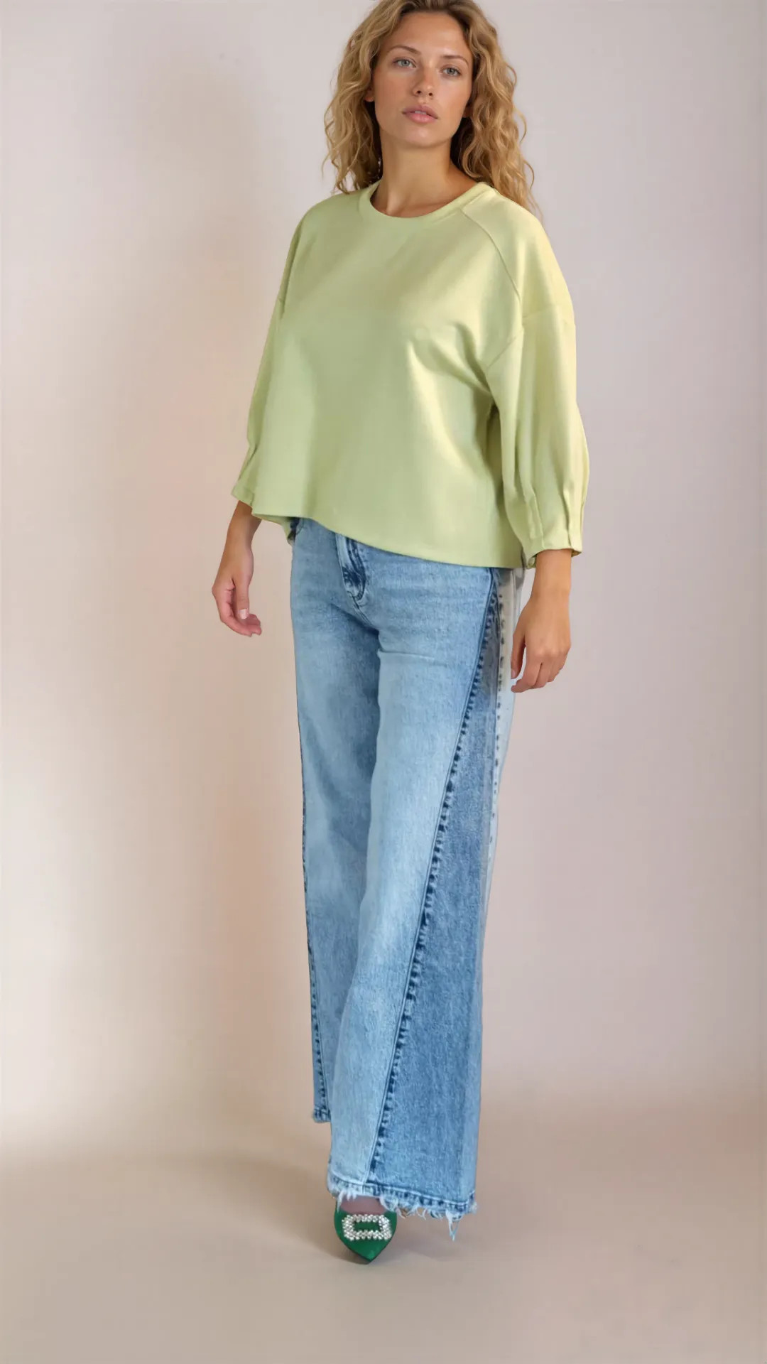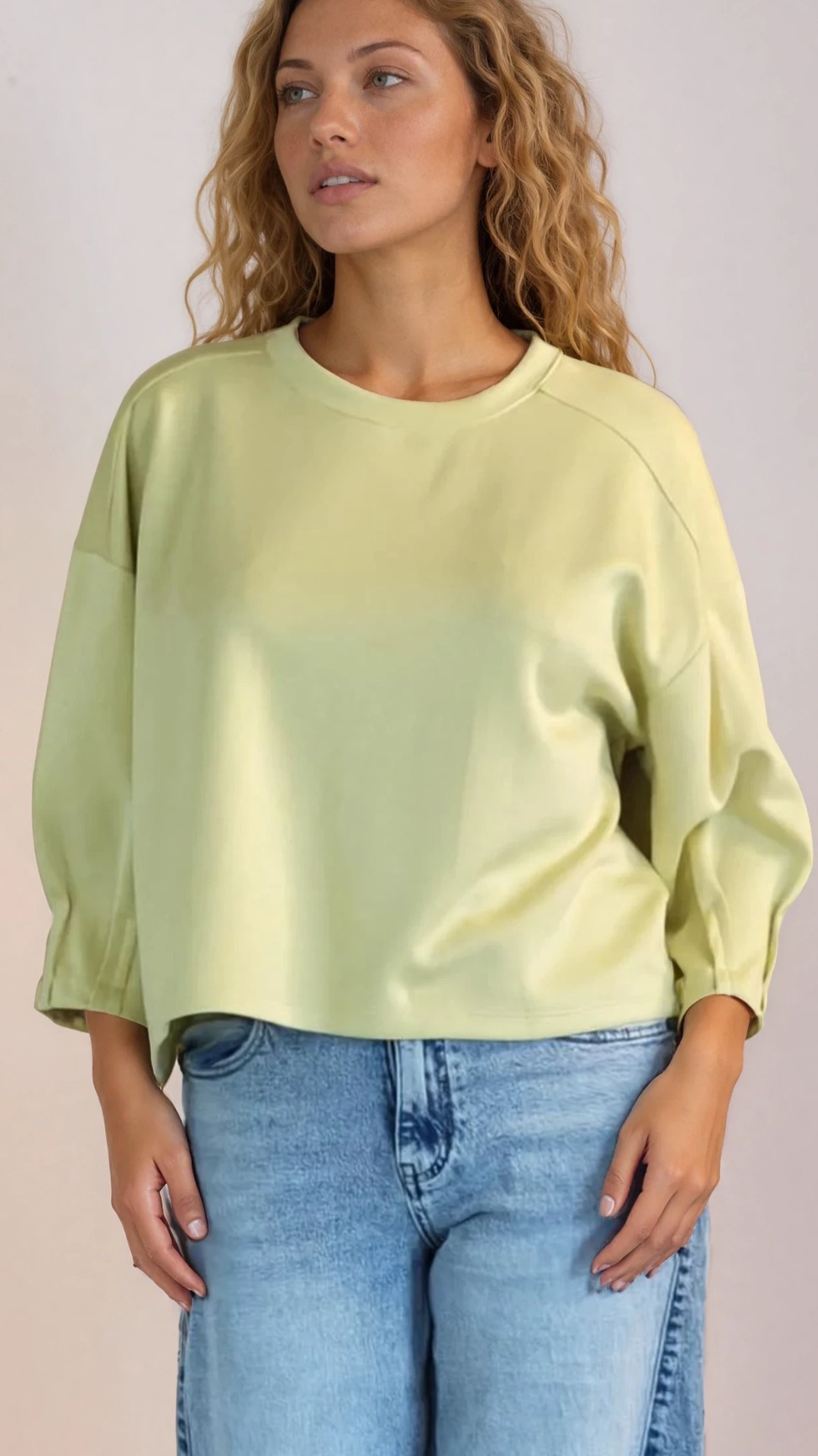 De relaxte pasvorm met rechte snit geeft bewegingsvrijheid zonder vorm te verliezen. De 3/4 mouwen met subtiele plooidetail zorgen voor een vrouwelijke twist, waardoor deze sweater net iets meer is dan een basic. Ideaal op denim, maar ook verrassend mooi op een geklede broek of rok.