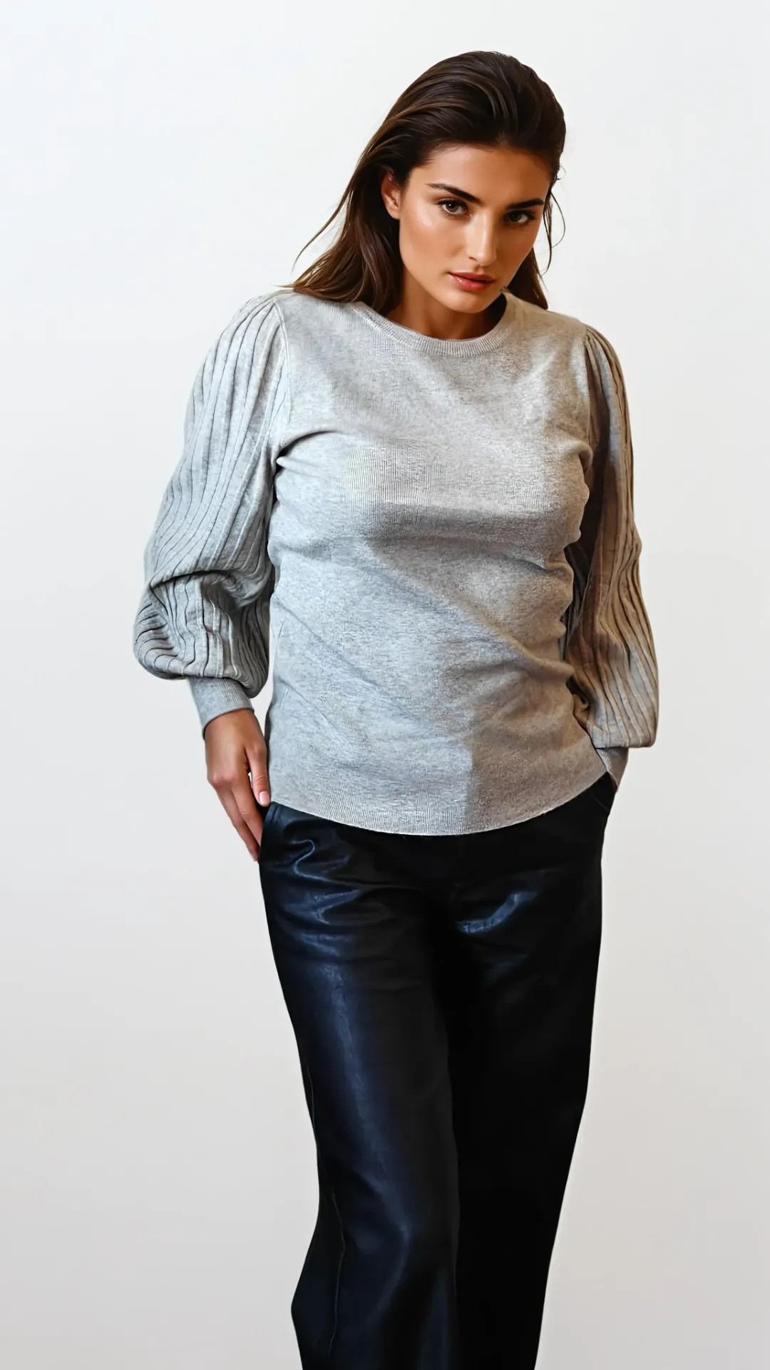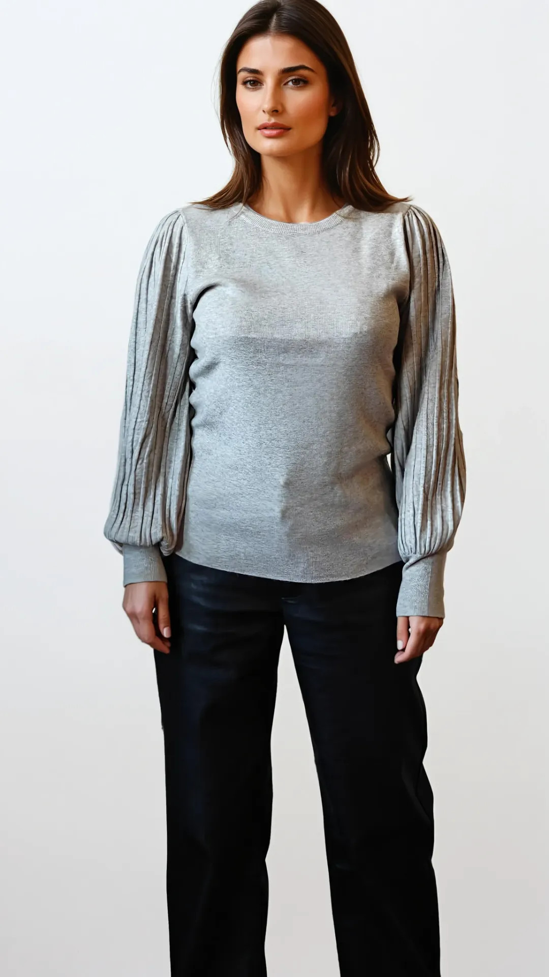 Deze Taille-Unique trui combineert een vrouwelijke licht aansluitende pasvorm met geplooide ballonmouwen, wat zorgt voor een luxueuze en tijdloze look.