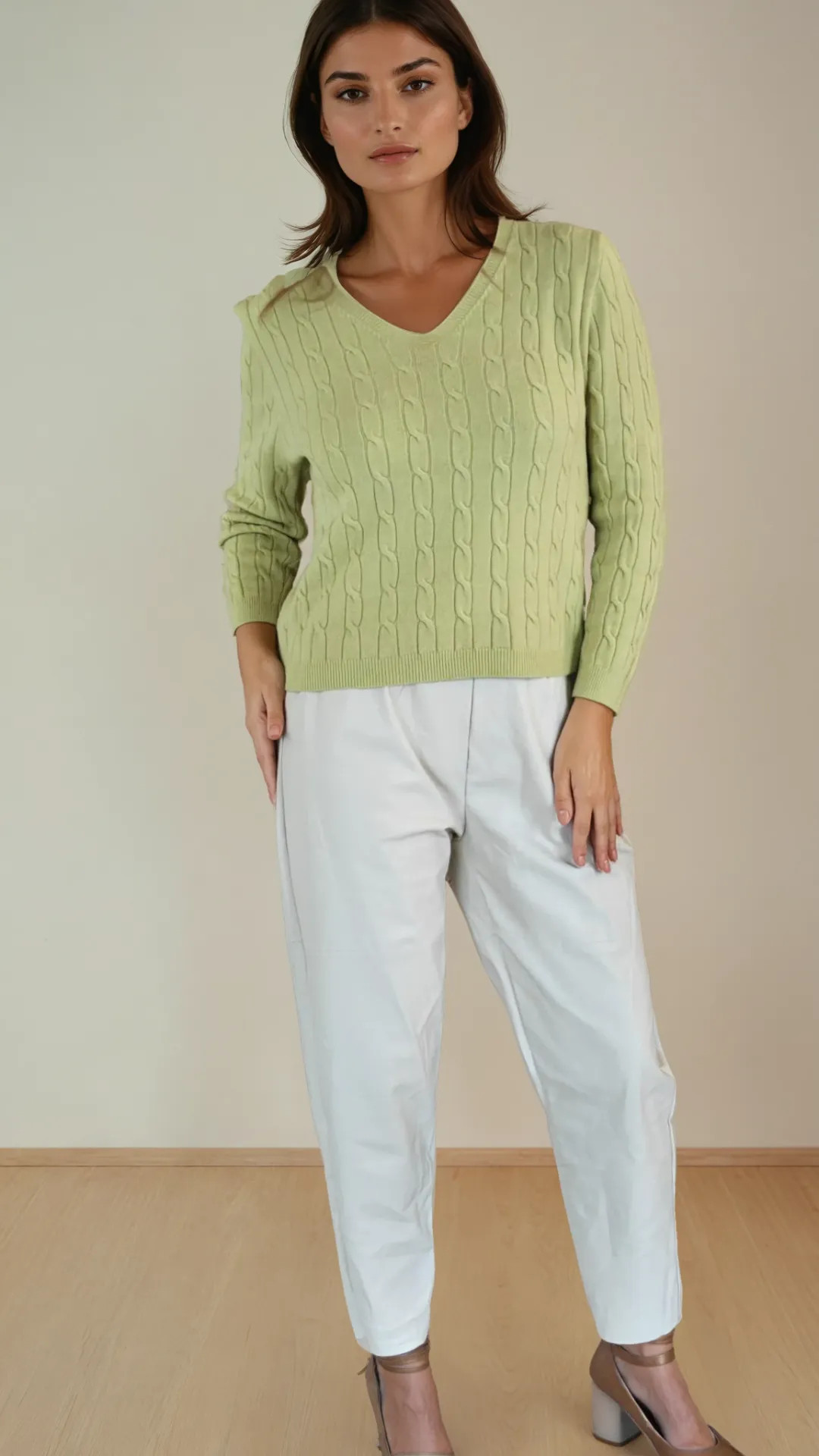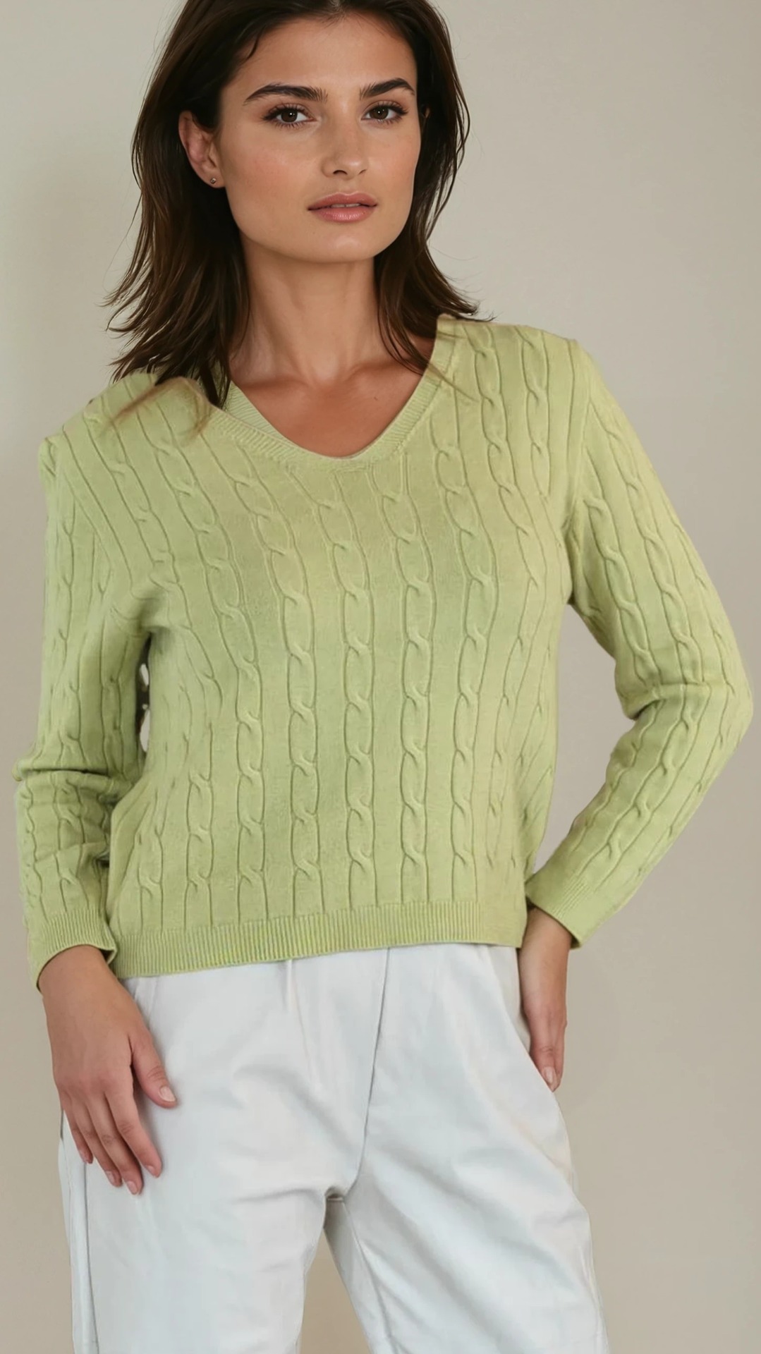 Het subtiele kabelpatroon geeft het truitje net dat extra detail, terwijl de V-hals zorgt voor een mooie, open halslijn. Een tijdloos stuk dat moeiteloos past in een verzorgde dagelijkse look, maar ook perfect werkt onder een blazer of jas.