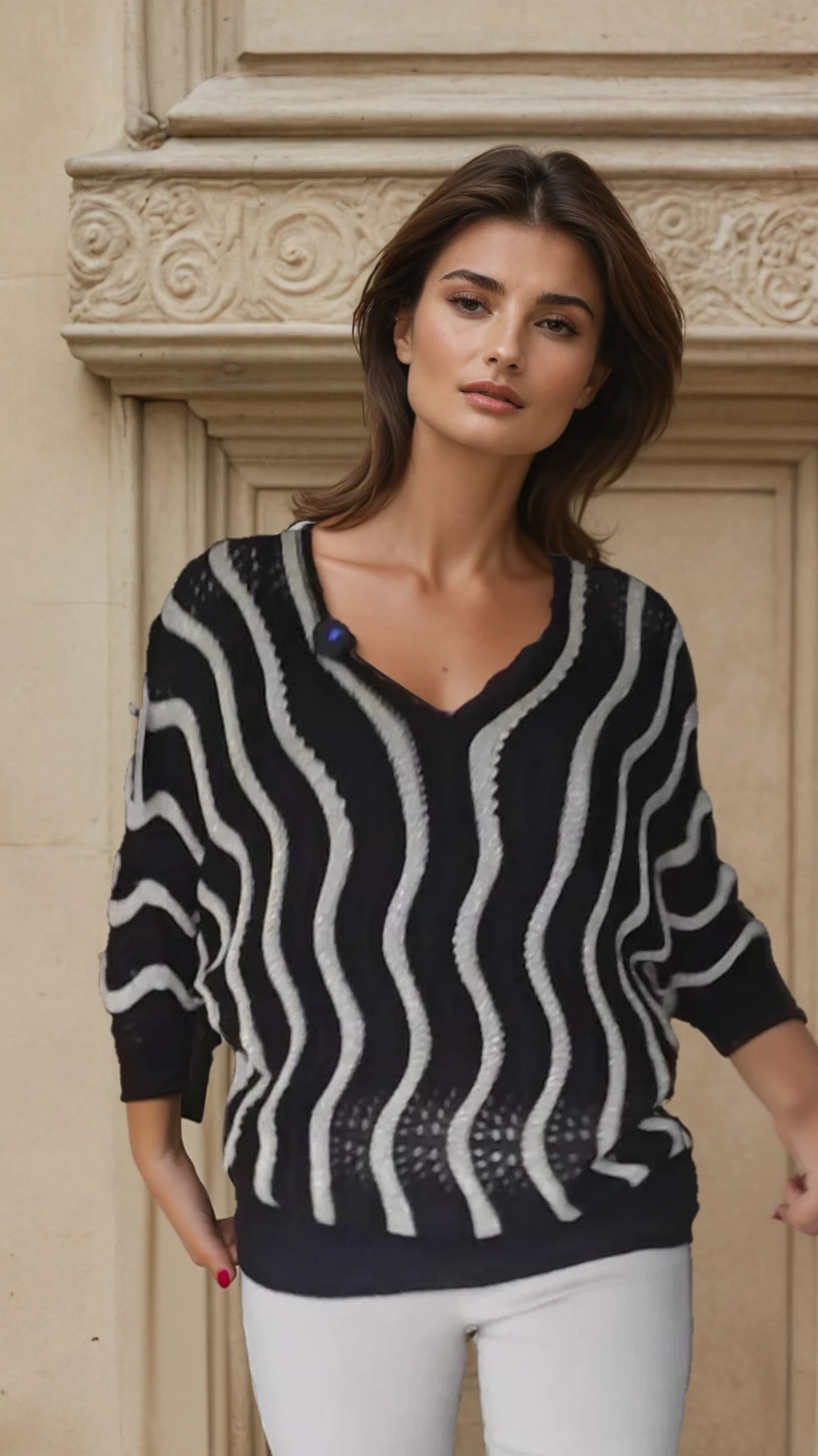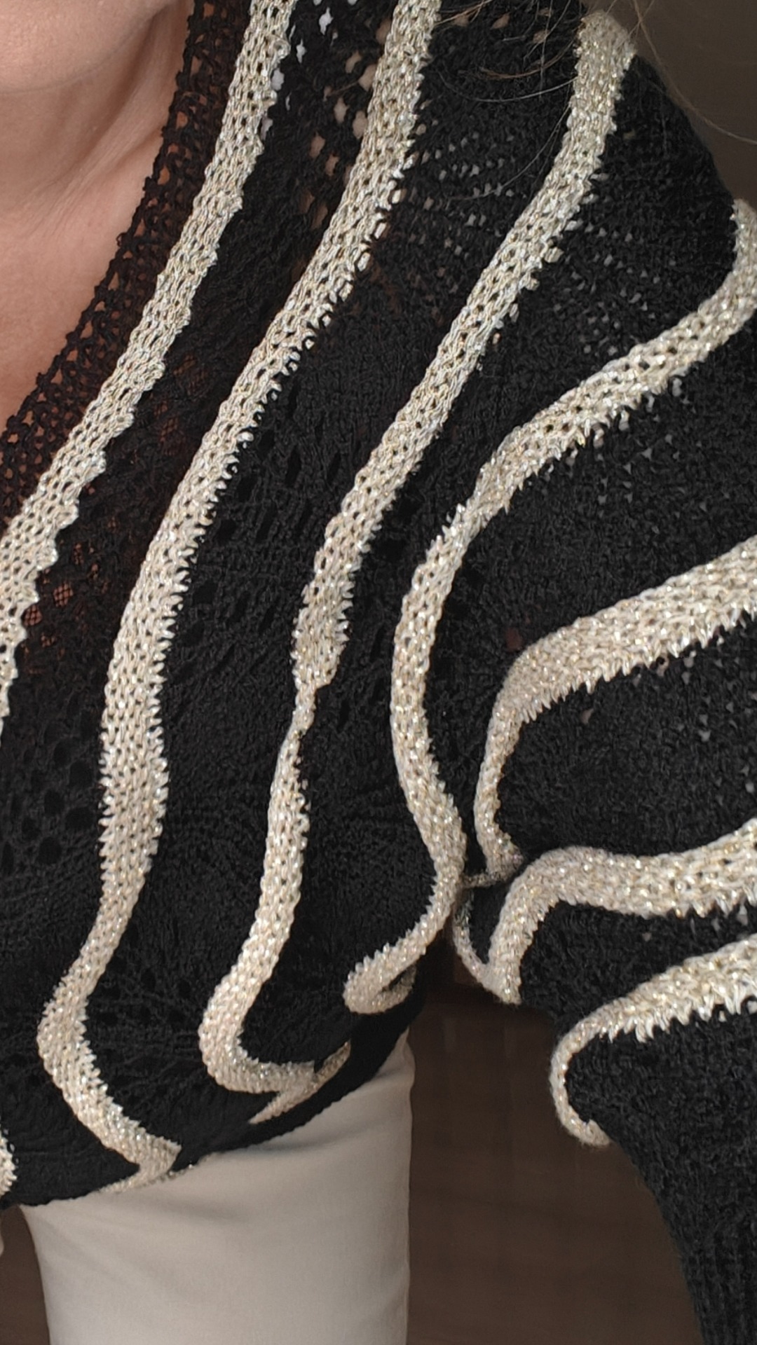 Truitje Sophie is een elegant fijngehaakt model met een mooie zwart-gouden uitstraling die meteen een geklede toets geeft aan je outfit. Dit truitje combineert comfort met een verfijnde look en is ideaal voor wie houdt van kledingstukken die je zowel casual als iets feestelijker kan dragen.