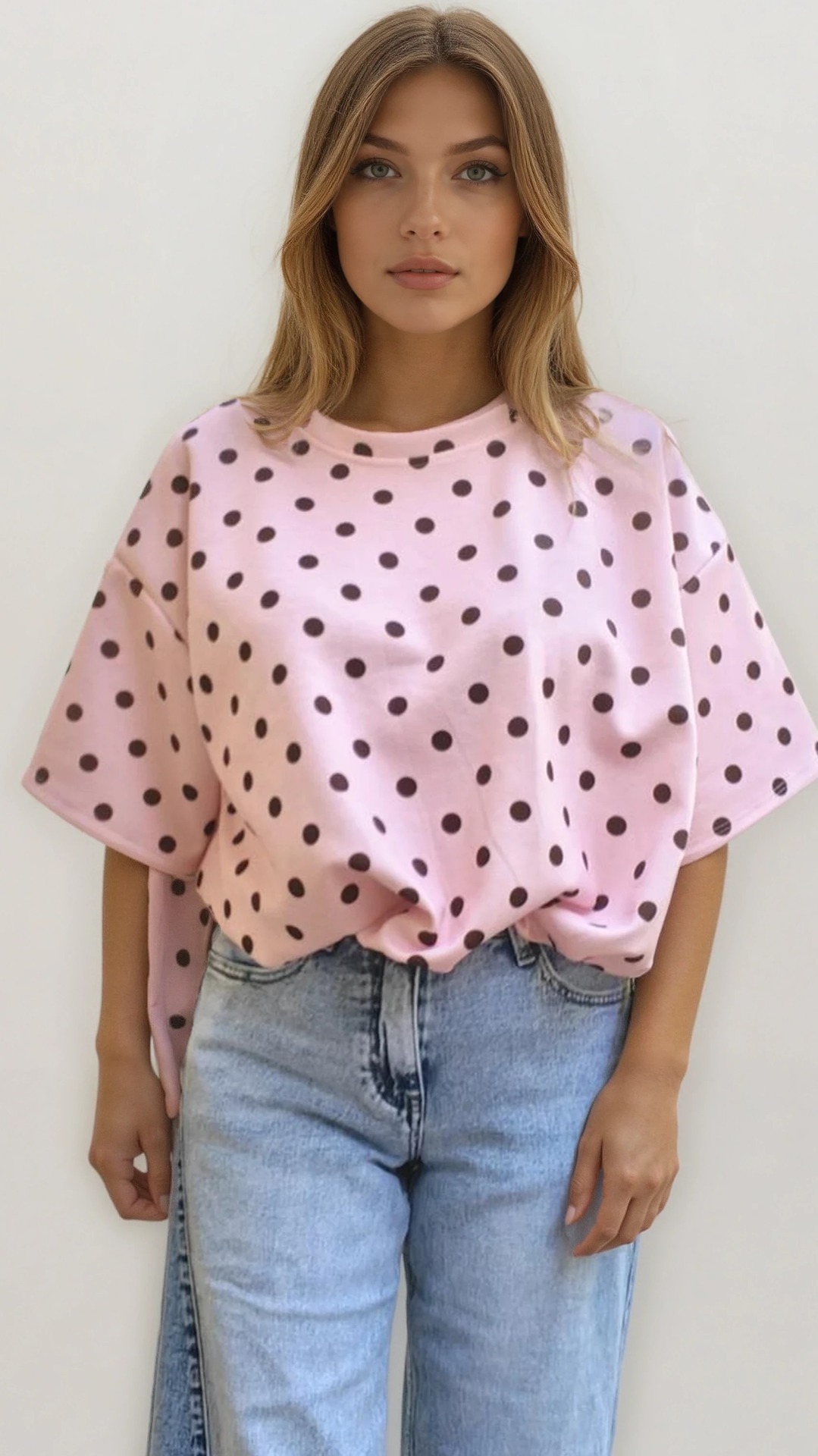 De losvallende pasvorm, korte wijde mouwen en speelse stippenprint geven dit truitje een luchtige, vrouwelijke uitstraling. Perfect op een jeans voor een casual look, maar ook leuk met een witte broek of rok voor een frissere outfit.